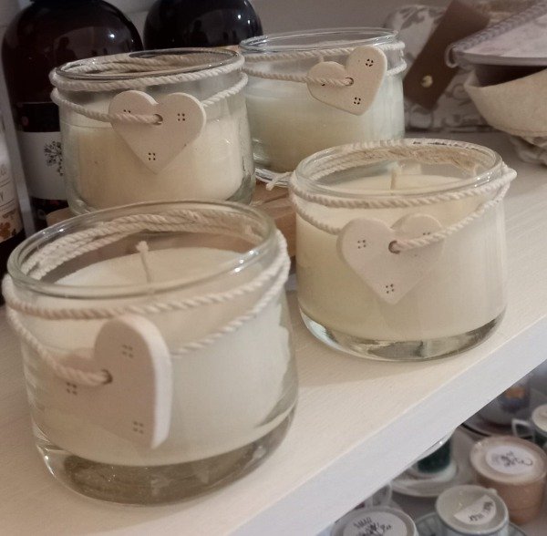 Vela en envase de vidrio con detalle de corazoncito. Aroma disponible de stock